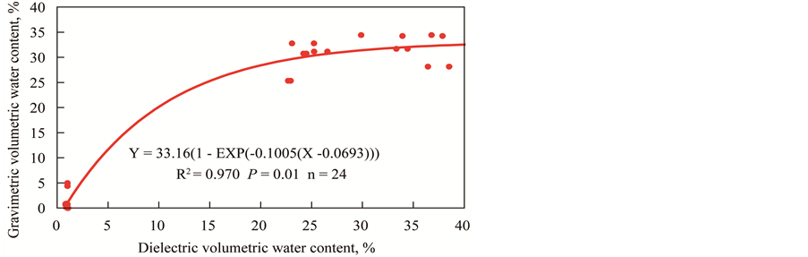 The ECH2O 10 dielectric aquameters were calibrated against volumetric soil water content by taking two soil samples near each probe centered at 0.20 m depth, once when the soil was relatively wet, and once when the soil was relatively dry, and also by preparing oven dry soil and placing the probes in the oven dry soil at the end of the trial. Gravimetric data were converted to volumetric water contents using the soil bulk density.