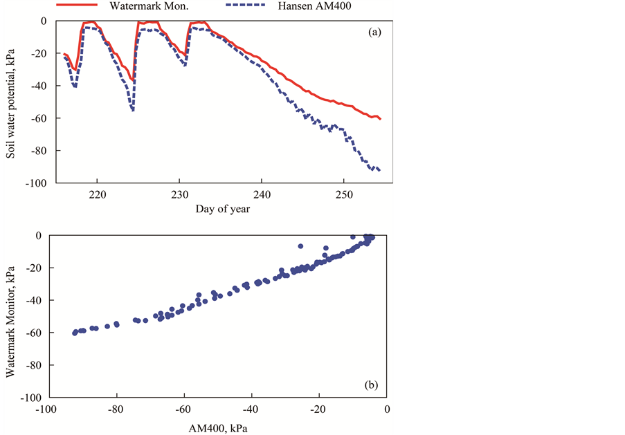 The automated collection of GMS data by an AM400 datalogger and a Watermark Monitor provided similar interpretation of wetting and drying cycles (Figure 11(a)). The GMS started responding to irrigation within one hour of the irrigation onset. Small differences in calibration equations were noted (Figure 11(b)) and slight differences in the interpretation of soil water potential near saturation were evident (Figure 11(a)).
