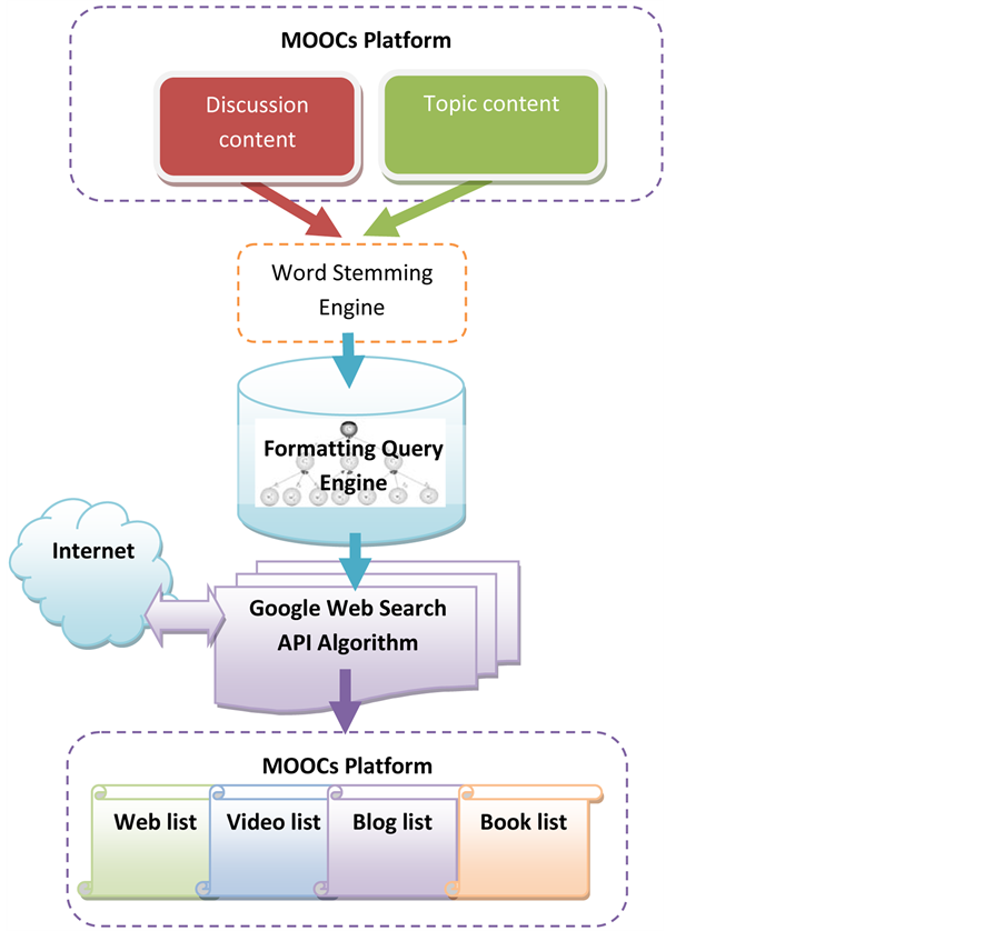 Display Results—this is to employ and re-rank the results into a uniform format for displaying to learners and deleting duplicates. According to the versatility of the content on the web, it makes sense for us to use Google Web Search API to retrieve a diversity of media related to topic taught in MOOCs. After formatting the query, it is sent to Google by the Google Web Search API Algorithm (GWSAPI). GWSAPI is embedded as a JavaScript in MOOCs webpage.