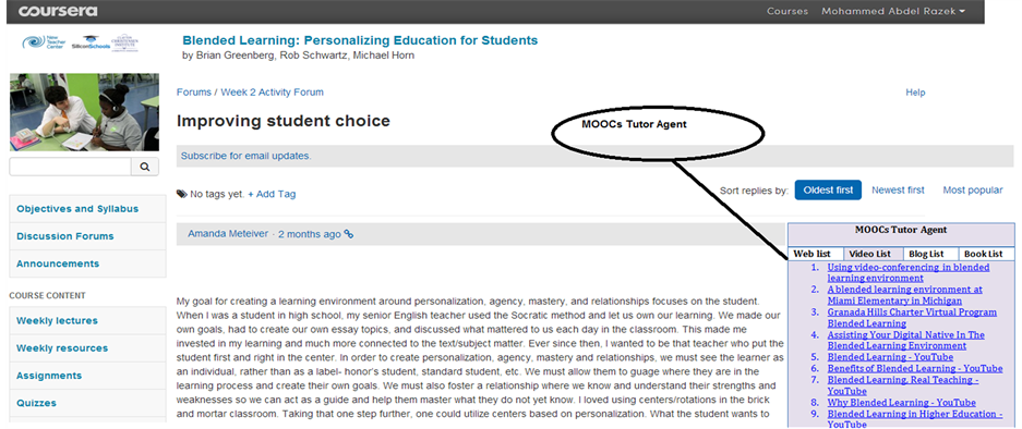 Figure 2. Coursera platform with embedding MOOCs tutors agent.