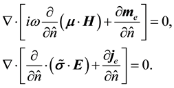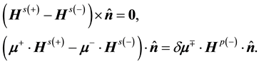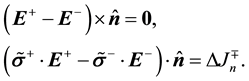 [1] . The former is yielded by applying Stokes’ law to a differential line integral on the interface between two media, and the latter is obtained by applying Gauss’ law to a differential sized cylinder surface containing a section of the interface. This gives two separate and implicit formulae that define “boundary equations” linking the boundary values of the fields in two anisotropic media. Two boundary equations are implicit functions of the interface normal