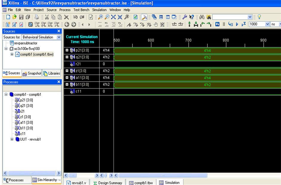 In Figure 9 a1, b1 and c1 are inputs, z1 is the difference output and r21 is the carry output. If a1 = 4, b1 = 2, c1 = 0, then the difference z1 is 2, carry r21 is “0”. This indicates a1 > b1. If a1 = 2, b1 = 4, c1 = 0, then the difference z1 is E, carry r21 is “1”. This indicates a1 < b1. If a1 = 4, b1 = 4, c1 = 0, then the difference z1 is “0”, carry r21 is “0”. This indicates a1 = b1.