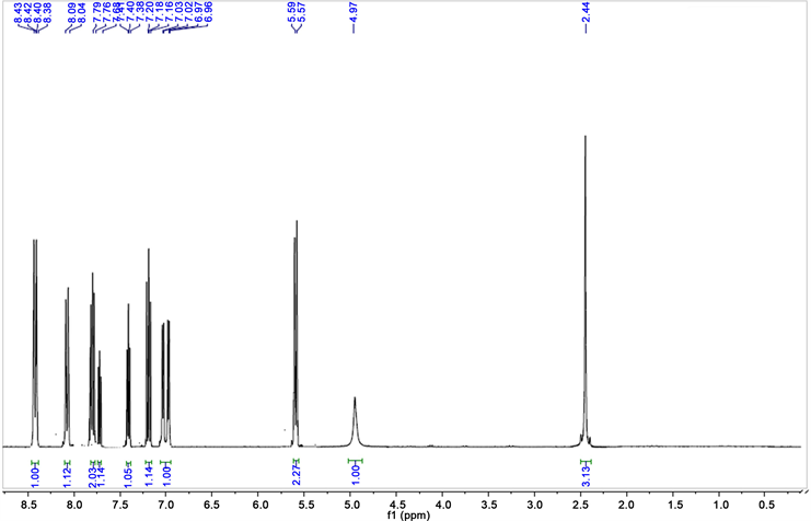 NMR 1H spectra of 7-methyl-6H-chromeno[4,3-b]chromenoquinoline and of 5,6-dihydro[-7-methyl-dibenzo(b,h)[1,6] naphthyridine are shown: