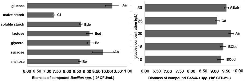 Figure 2. Effects of different carbon source and different concentration of glucose on the spore yield of compound Bacillus spp. Note: Different capital letters indicated that each treatment reached a very significant difference (p < 0.01). Different lowercase letters represented significant difference within treatments (p < 0.05). It was the same below.
