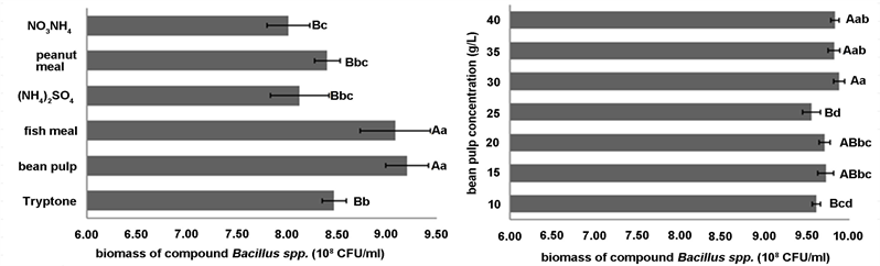As was shown in Figure 3, compound Bacillus spp. was more suitable to utilize organic nitrogen sources compared with inorganic nitrogen sources. Among the organic nitrogen sources, the utilization of bean pulp and fish meal was significantly higher than other nitrogen sources while inorganic nitrogen sources such as (NH4)2SO4 and NO3NH4 were unbeneficial to the formation of bacteria spores. When the bean pulp concentration was 30 g/L, the biomass of compound Bacillus spp. reached the highest than that of when the bean pulp concentration was less than 30 g/L. There was no significant difference when the bean pulp concentration was above 30 g/L, indicating that the high concentration of bean pulp might be too viscous to facilitate the transfer of dissolved oxygen.