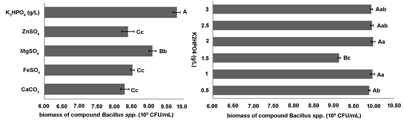 Figure 4. Effects of different mineral salts and different concentration of K2HPO4 on the spore yield of compound Bacillus spp.
