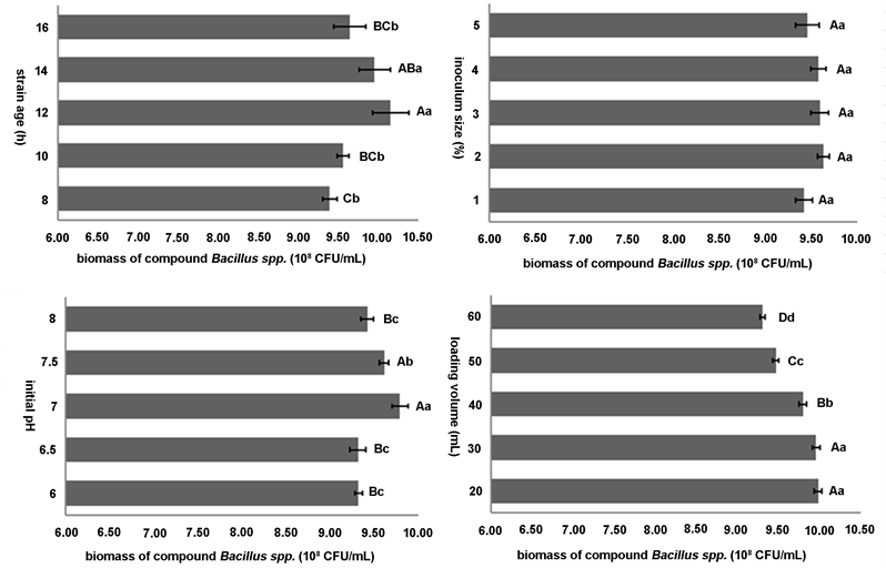 Set different strain ages in “optimized medium”: 8 h 10 h 12 h 14 h 16 h; inoculum amount: 1% 2% 3% 4% 5%; initial pH: 6.0 6.5 7.0 7.5 8.0; loading volume: 20 ml/250 ml 30 ml/250 ml 40 ml/250 ml 50 ml/250 ml 60 ml/250 ml. With the above exploration, we could obtain the effects of fermentation conditions on the biomass of compound Bacillus spp.