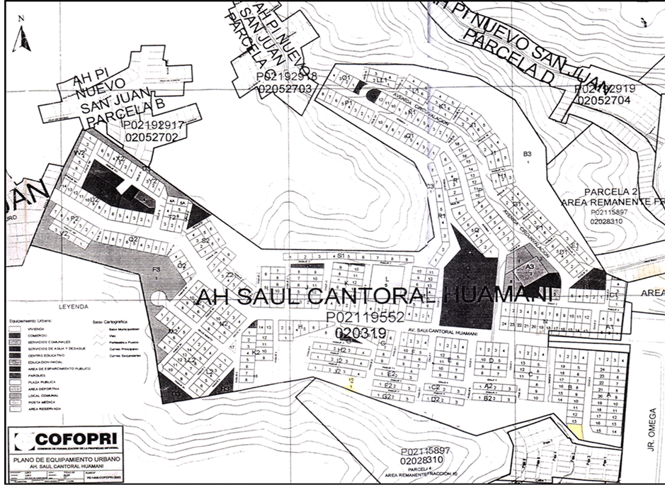 These activities were organized as part of the broader regularization program to formalize the entire informal area. Eventually, the field survey indicated that the titling program delivered 496 titles in the Saul Cantoral informal settlement. Again, the new urban plan (shown in Figure 11) reserved 22 plots for community facilities and commercial functions.