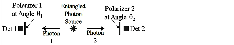 Figure 1. The Bell’s theorem test of quantum mechanics uses a source of entangled photons, where each photon goes to a different detector through two different polarizers. The probability of simultaneous detection is proportional to