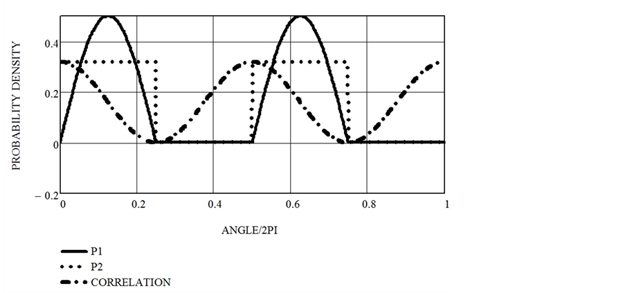With this formulation, the next step is to choose two different real, non-negative functions over 0 - 2π which integrate to unity and whose cross-correlation probability distribution is