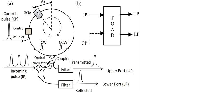 Figure 1. (a) A TOAD based optical switch with single control pulse (CP), where SOA: Semiconductor optical amplifier, CW: Clockwise pulse, CCW: Counterclockwise pulse and Δx: asymmetric distance. (b) The schematic diagram of TOAD based switch.