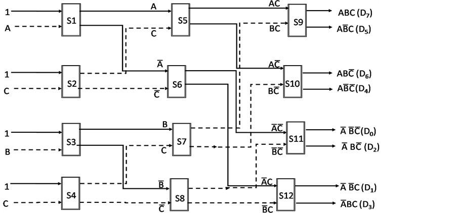 A decoder is a combinational circuit that converts binary information from n input lines to a maximum of 2n unique output lines. The only inputs in decoders are the control bits. In digital electronics, a decoder can take the form of a multiple-input, multiple-output logic circuit that converts coded inputs into coded outputs, where the input and output codes are different e.g. n to 2n. A block diagram of 3:8 decoder (3 input lines and 8 output lines) is shown in Figure 2. To implement the optical 3:8 decoder, we use TOAD-based optical switches, namely s1 to s12 as shown in Figure 2 which has three select inputs (A, B and C). It is to be noted that the output of a TOAD-based switch can be used as a control signal for the other provided its intensity is increased suitably through an erbium-doped fiber amplifier and the wavelength is changed through a wavelength converter. The solid lines indicate that the output of one switch is directly connected to input of another switch. The dotted lines indicate that the output of one switch is connected to input of another via wavelength converted and erbium-doped fiber amplifier.
