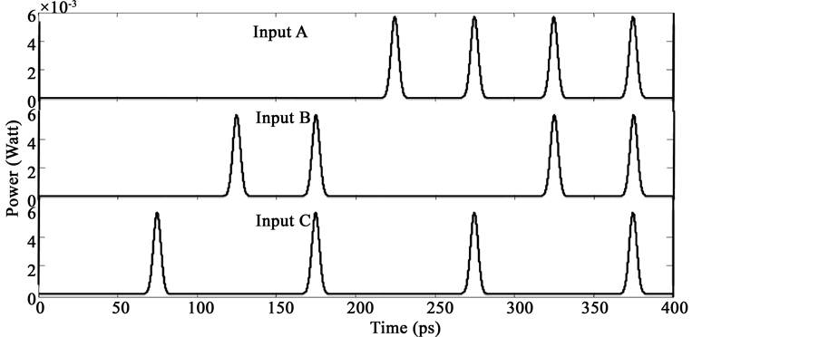 The parameters used in this simulation are taken from the literature survey of different research papers [1] [2] [25] [26] . The values of different parameters as : unsaturated amplifier gain of the SOA (Gss) = 30 dB, gain recovery time of SOA (τe) = 90 ps, saturation energy of the SOA (Esat) = 1000 fJ, eccentricity of the loop (Tasym) = 30 ps, line-width enhancement factor (α) = 6, full width at half maximum of control pulse (σ) = 6 ps, bit period (Tc) = 100 ps, and a control pulse energy (Ecp) = 100 fJ so that the operational conditions are satisfied. The simulated input waveforms are shown in Figure 3. The simulated output waveforms are shown in Figure 4.