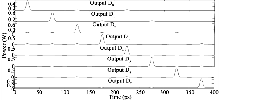 Figure 4. Simulated output waveforms, where power (Watt) is along the y-axis whereas time (ps) is along the x-axis.