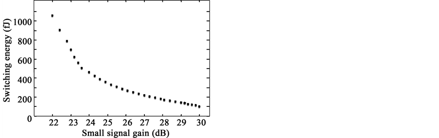 To study the operation of the circuit, we find the appropriate value of the SOA small signal gain for which switching energy is minimized. For this reason, the switching energy’s dependence on the small signal gain is plotted in Figure 5. It can be seen from this figure that the energy decreases exponentially with the increase of small signal gain and reaches a minimum value of 100 fJ at 20 dB.