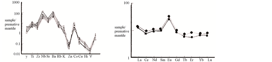 To display the trace elements distribution in the studied gabbros they are plotted on spider diagram normalized to Primitive mantle according to Wood et al., 1975 [13] (Figure 3(a)) shows that the studied gabbros are depleted in Cr, Cu, Zr and Ni and enriched in the other element. The REE pattern of the studied gabbronorite and anorthosite (Figure 3(b)) are very similar to each other and similar to that of calc-alkaline rocks.