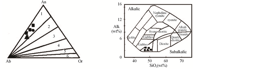 The studied gabbroic rocks are chemically classified using the following relationships: On the normative Ab-An-Or diagram (Figure 3(c)) according to Streckeisen, (1976) [10] , the studied younger gabbros plot in the gabbro diorite field. On the (Na2O + K2O) vs. SiO2 diagram (Figure 3(d)) according to Wilson, 1989 [14] all the analyzed rocks plot in the field of gabbro