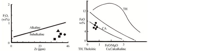 On the relation between Alk, vs. SiO2 (Figure 3(d)) the gabbros plot in the sub alkaline (calc-alkaline) field. The Same conclusion is reached on plotting the analyses of the studied gabbro on Zr vs. P2O5 diagram (Figure 3(e)) according to Winchester and Floyd, 1977 [15] , where they plot in sub alkaline field. In the relation between FeO vs. (FeO*/MgO), according to Miyashiro, 1975 [16] (Figure 3(f)) the younger gabbros plot in the calc-alkaline field. In conclusion the younger gabbro of Wadi Shianite area originated from a calc-alkaline magma source similar to other younger gabbro in different areas in the Eastern Desert of Egypt (Takla et al., 2002) [9] .