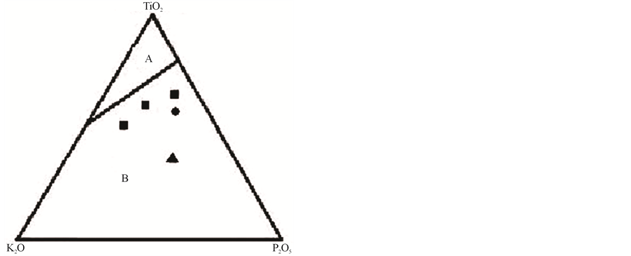 The tectonic setting of the studied gabbroic rocks can be predicted by using TiO2-K2O-P2O5 ternary diagram (Pearce et al. 1975) [17] . On this diagram the studied gabbros plot in the continental field (Figure 4).