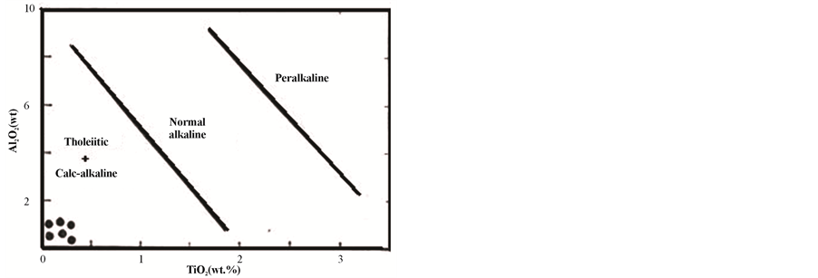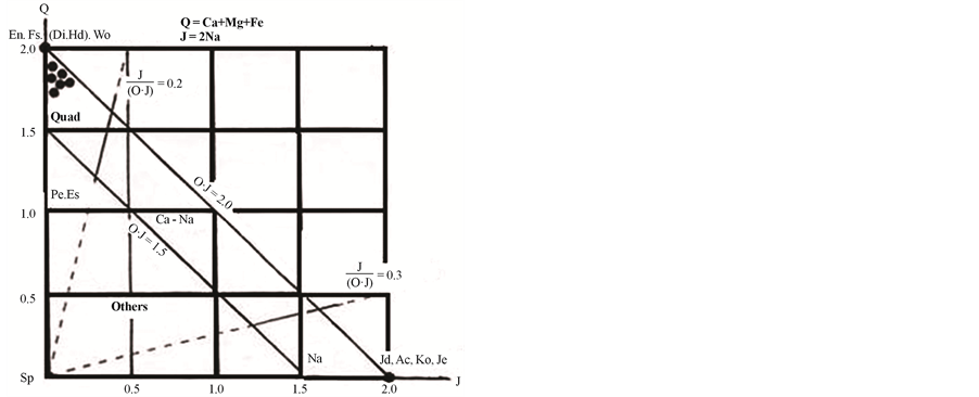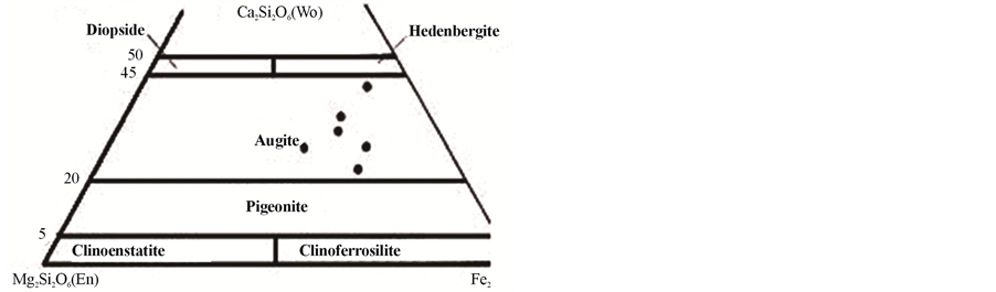 FeO and J = 2Na (plot Figure 5(a)) according to Morimoto et al. (1988) [18] , the data plot at Q + J between 1.5 - 2.00. In the CaSiO3 (Wo), MgSiO3 and FeSiO3 triangular diagram (Figure 5(b)) according to Deer et al. (1992) [19] the clino-pyroxene fall in Fe-augite field. On TiO2 vs. Al2O3 diagram (Figure 5(c)) according to Le Bas (1962) [20] the studied clino-pyroxene plotted in Tholeitic + Calc-alkline figure.