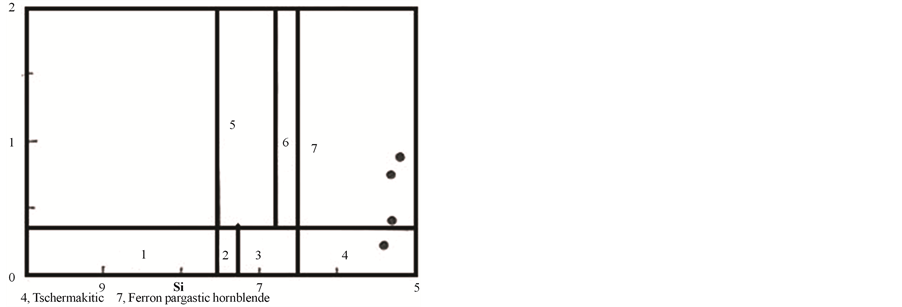 On Si vs. (Na + Ka) diagram (Figure 5(d)) according to Leak (1978) [22] , the majority of samples plot in the ferroan pargastic hornblende field and one sample plot in tschermakitic field.