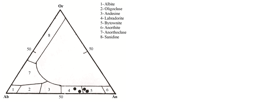 Plagioclase is ubiquitous mineral in all the studied samples. The mineral compositions are given in Table 4(c). Or-Ab-An ternary diagram (Figure 5(e)) according to Deer et al. (1992) [19] shows that the studied plagioclase analyses plot in the labradorite (An 63) and bytownite (An 76) fields.