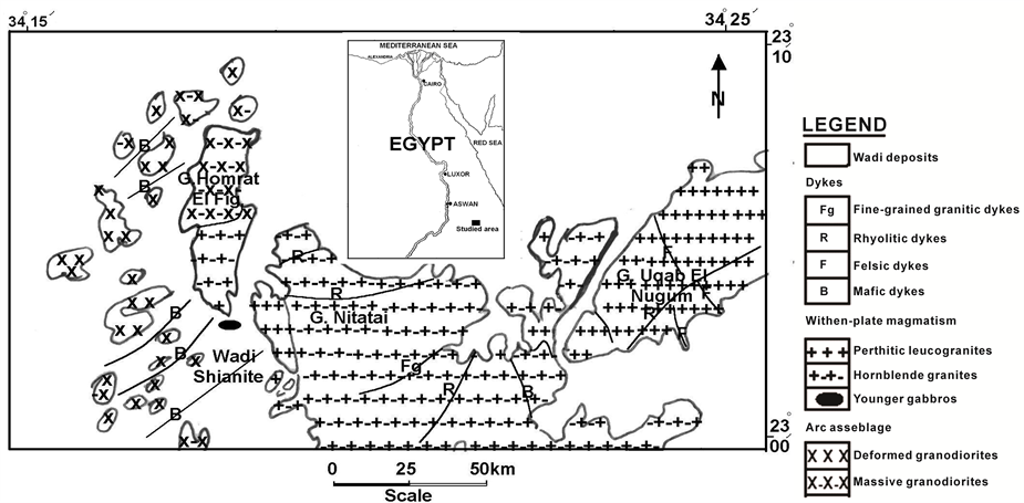 The studied area is located between longitude 34˚15' - 34˚25'E and latitude 23˚00' - 23˚10'N. It covers by Precambrian rocks represented by massive granodiorite, deformed granodiorite, younger gabbro, hornblende granite, and perthitic leucogranite (Figure 1).