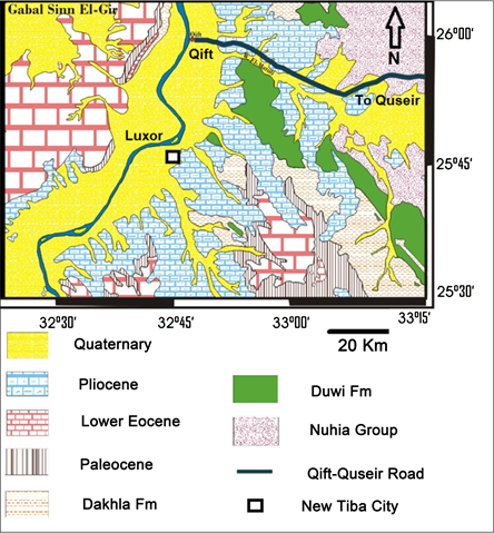 as well as the Pliocene-Recent sediments [15] . The surface of the study area is covered by Quaternary sediments in the form of alluvial sands, gravels, clays or mud, and Wadi deposits. The studied soils are distributed in the study area as showed in a geological map (Figure 3). The studied area is located at the border between the eastern desert and the Nile valley. The area surrounding the New Tiba city is dissected by several structurally controlled large Wadies (valleys) like Wadi Madamoud to the south of this city, Wadi Banat Biri and Wadi Khozam. The directions of these Wadis are running from the southeast to the northwest dependent the main fault trend in the area.
