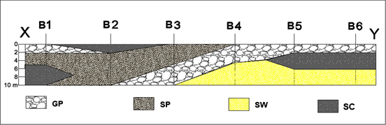 Figure 5. Vertical cross-section along the studied road area illustrates four different layers of soils; Borehole (B), poorly graded gravel (GP), poorly graded sand (SP), well graded sand (SW), and clayey sand (SC).