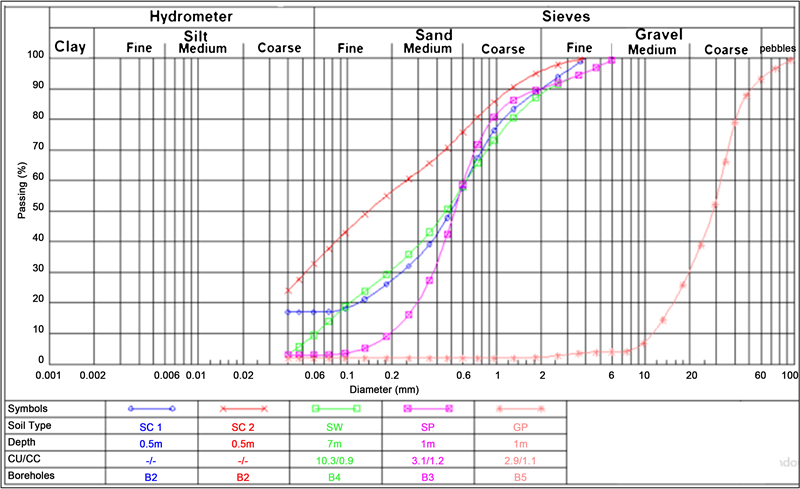 Figure 7 showed the grain size distribution curves of the studied samples. The results of the grain size distribution test of the studied soils showed that the gravel samples were classified as poorly graded gravels (GP) according to unified soil classification system (USCS) where the gradation parameters of the studied gravels including coefficient of uniformity (Cu) were less than 4. Sand samples especially at boreholes no. 4, 5, and 6 were classified as well graded sands (SW)