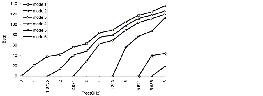 Figure 4 shows the first propagation constant of the six modes of a frequency band that ranges from 0 to 6 GHz. In our work we chose a frequency of 5 GHz, and in that frequency the Figure 4 shows that there are 4 modes present in the structure.