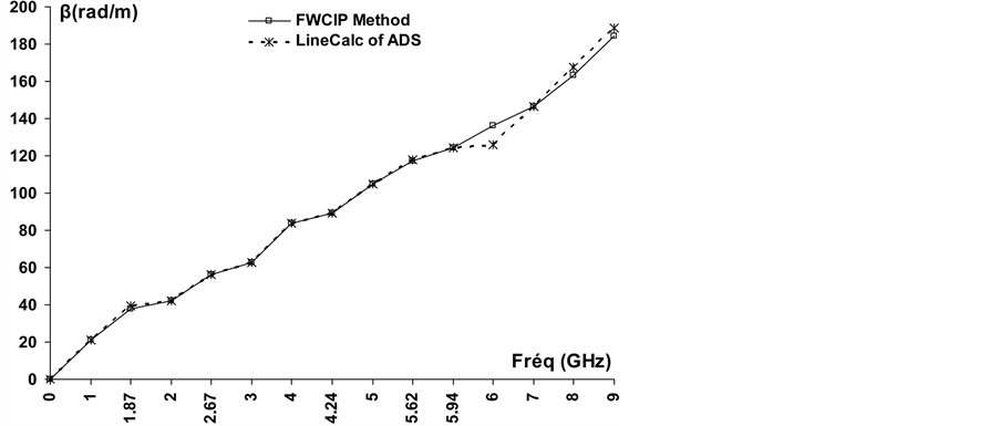 Figure 5 shows the results of the propagation constant b of the fundamental mode are in good agreement with those calculated by the Line Calc software ADS. This validates our calculation method.
