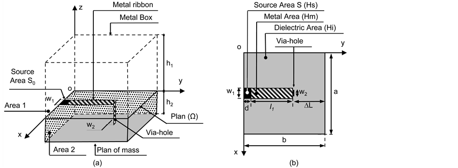 The study of structure (Figure 1(a)) is a microstrip line dimensions (Lxw1), connected to the ground through a via-hole of dimensions (h2xw2). The thickness of the line and the via-hole is assumed to be negligible. The excitation of the structure is provided by a source of localized electric fields S0{E0,J0}. The plan W (Figure 1(b)) is located between two dielectric media, relative permittivities εr1 and εr2 supposed without losses.
