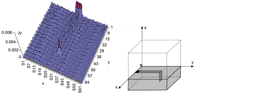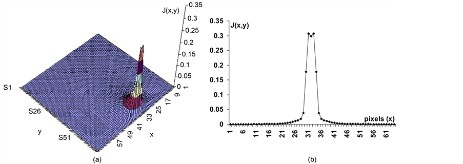 Figure 9. J current appearance at the via-hole for w = 5 mm. (a) in 3D, (b) in 2D for y = 63 pixels.