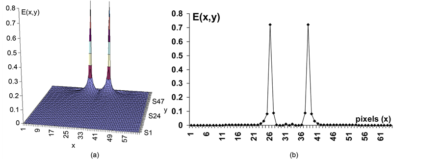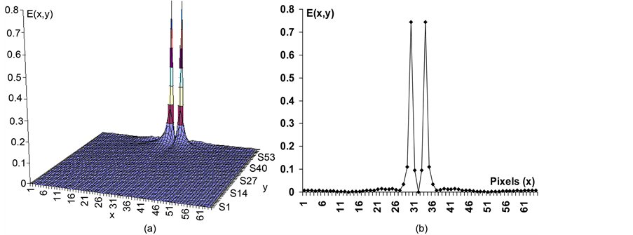 Figure 11. Appearance of the field E (x, y) at the via-hole for w = 15 mm. (a) in 3D, (b) in 2D for y = 63 pixels.