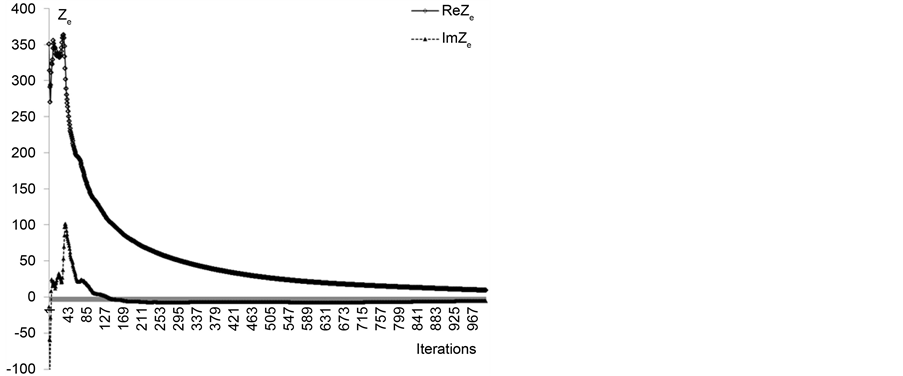 This Figure 12 shows that the number of iterations required for convergence of results is obtained from 200 iterations for the imaginary part of the impedance input Ze and from 700 iterations for the real part of impedance input Ze. So the results obtained below are at the convergence.
