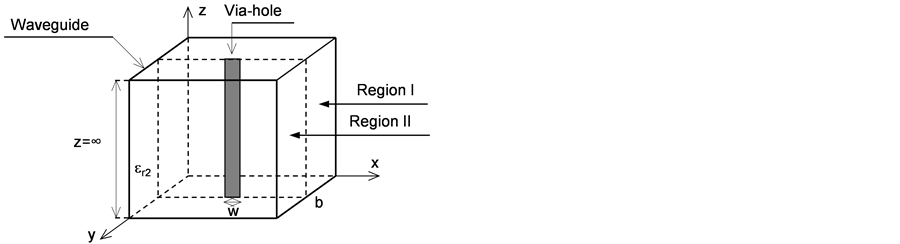 To calculate the electric field created by the via-hole in the study of structure, we assume that it is placed in a rectangular waveguide with metal walls and filled with a dielectric substrate relative permittivity er2 (Figure 3). The via-hole and the waveguide are considered infinite in length to eliminate side effects. We also neglect the losses in the conductor and the dielectric thereby further simplifies the problem formulation.