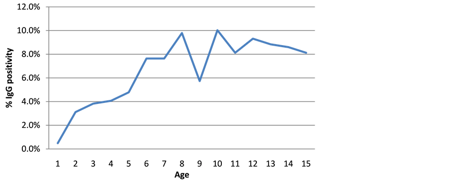Table 1 shows the different characteristics of the population by IgG positivity. A total of 900 subjects, comprising of 461 males and 439 females, were surveyed, from which 419 (46%) had IgG antibodies in their blood. The mean age for IgG positive subjects was relatively higher to the IgG negative subjects (9.5 ± 3.7 years vs. 6.7 ± 4.2 years; p-value < 0.001). About 61% children, with positive IgG were of the age of more than 10 years (Figure 1).