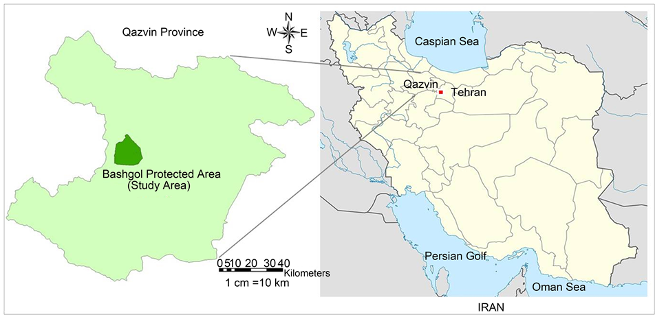 With an area of 24399 hectares, Bashgol protected area is located 3km from the northwest of Takestan between Takestan and Abhar cities in the southern skirts of the Central Alborz Mountains and lies inside 49˚28' to 49˚43' east longitude and 36˚03' to 36˚14' north latitude (Figure 1). As the only protected area of Qazvin province, this area is the only deer habitat, with little population, and is the easternmost region in Iran in which Armenian mouflons have been dispersed.