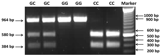 Figure 2. The PCR-RFLP analysis of the G/C polymorphism in intron 5 of the bovine RELA gene. Electrophoresis was performed using 1.5% agarose gels. Arrows on left hand side show the positions of the undigested 964 bp PCR product and the two PCR products digested with BsrBI restriction endonuclease. Examples of the heterozygous genotype GC, homozygous genotype GG and homozygous genotype CC are shown.