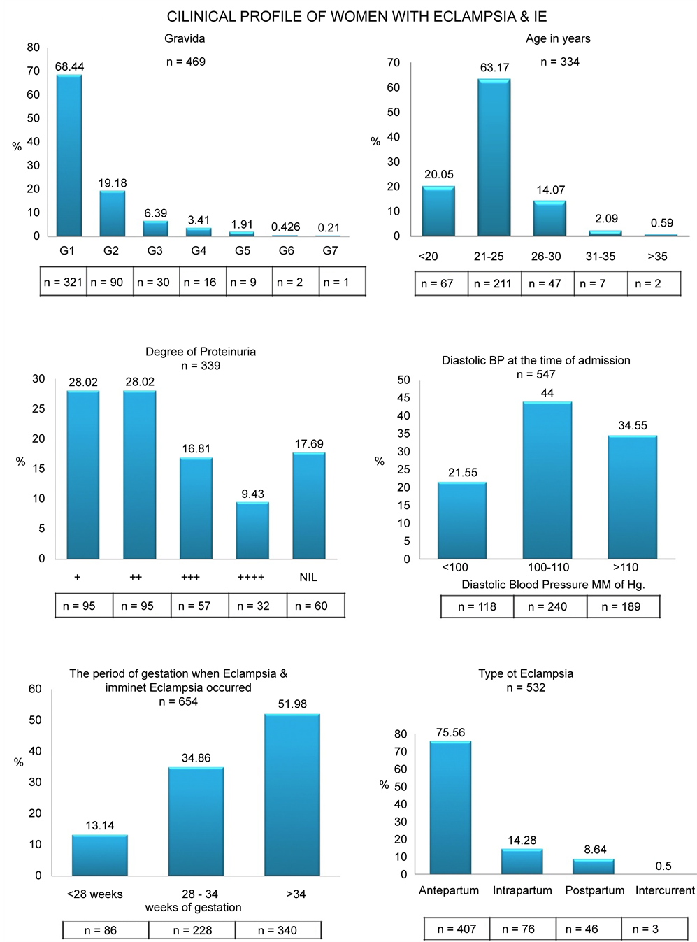 Among 469 pregnant women with eclampsia and IE, 321 women (68.4%) wereprimies, 90 women (19.18%) were gravida 2, 30 women (6.39%) were gravida 3, and remaining 28 women were gravida 4 and 4+.
