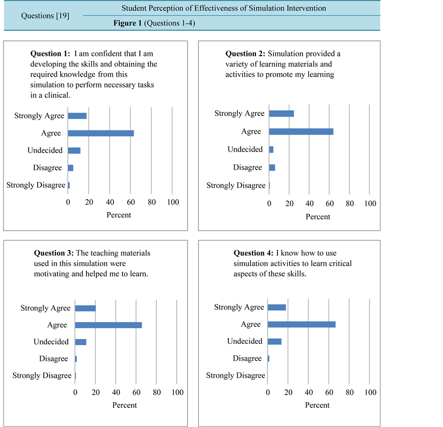 In measuring student perceptions of effectiveness of the simulation intervention, the result was also statistically significant. 81% of the students strongly agreed or agreed that that the simulation experience was helping them to develop the skills and obtain the knowledge necessary to perform confidently in clinical situations. The four questions applicable to this paper are seen in Figure 1.