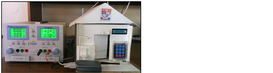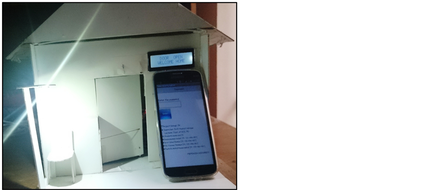 Figure 5(a) shows a practical implementation of home security system which is receiving a password from physical environment to unlock the door. This function is accomplished by interfacing with keypad and microcontroller. Moreover, the password is displayed at LCD and the system remains at waiting state until password is conformed from user end.