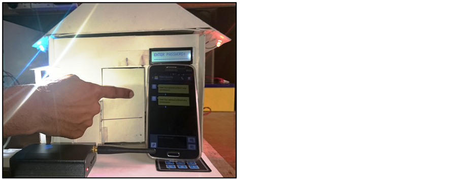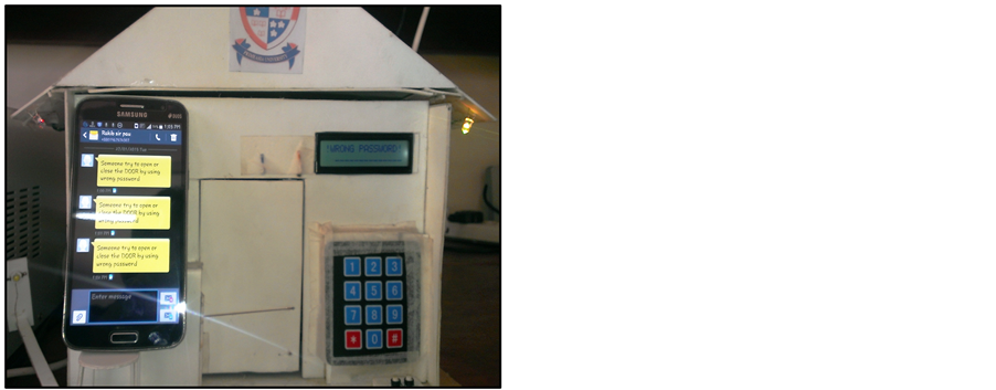 Figure 7(a) shows the practical implementation of mal-operation which has been occurred by pressing wrong password. As a result the system activates all the security system. This includes an alarming message to owner mobile phone, turn on the Buzzer and LED. The system sustains the hazardous condition until the whole system is become reset.