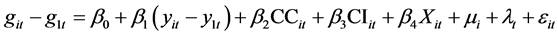 where g denotes the growth rate of per-capita GDP, y the initial log of per-capita GDP, CC the log of consumer credit, CI the log of investment credit and X a set of control variables. Control variables used in our econometric investigation are GC the log of government consumption to GDP, INF inflation rate and Trade the log of the ratio of exports plus imports to GDP. Country 1 is the technology leader.
