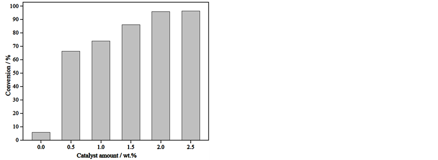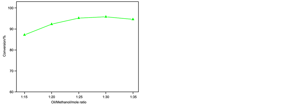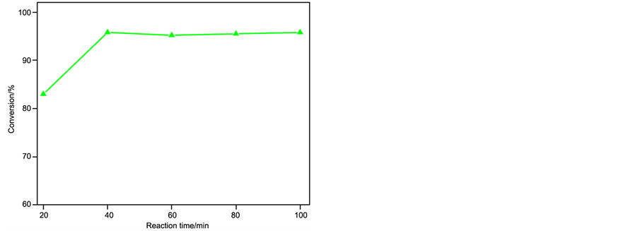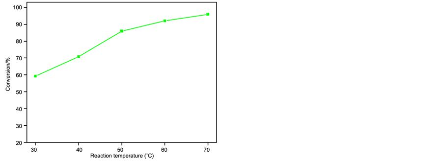 In addition, the effect of reaction temperature on the conversion was also studied (Figure 1(c)). The results indicated that the conversion raised with the increase of temperature from 30˚C to 70˚C, and the conversion reached 95.8% at 70˚C; however, when reaction temperature was beyond 70˚C (methanol refluxing temperature), the esterification reaction was not easy to operate. Therefore, the optimum reaction temperature for this reaction was 70˚C.