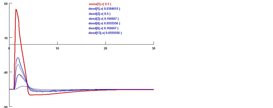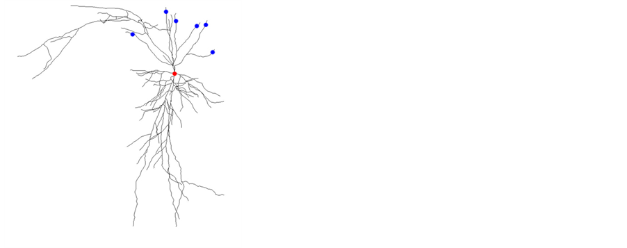 Figure 6. Pyramidal cell morphology and electrical activity simulation. a) Single pyramidal cell voltage, probe method to ensure the section voltages in soma (red point) and dendrites (blue points); b) Different synapse sections and soma voltage changing by multi stimuli from six neurons. Both soma [i], v[j] and dendrite [i], v[j] sections are built in this model, i stands for the section id, j denotes the detection probe position. The average decay factor is calculated by means of these six voltages.