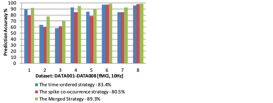 though the proposed strategies are different, the results from the two different strategies do not have major conflicts, instead they are very consistent, and support each other. 2) The neural network structure prediction accuracy for the time-ordered strategy is 83.4%, and the accuracy for the spike co-occurrence strategy is 80.5%. When we group the two neural network structures together (denoted as the merged strategy), the prediction accuracy reaches 89.3%. Figure 7 shows the prediction accuracy for each of the dataset using the proposed strategies. This result indicates that better prediction can be made when the predicted pathways from the two strategies are combined together. 3) 27% of the possible connections among neurons are selected for the time-or- dered strategy, while 25% of the connections are selected by the spike co-occurrence strategy. If the two results are grouped together, 32% of the possible connections are included. The results seem good, since the coverage is not high (and is consistent with the observation by using electro-microscopy techniques [15] [16] ), while the predicted accuracy for possible neural network structure reaches 89%. Comparing with other correlation strategies, merged strategy shows better prediction accuracy results as Figure 8 shows.