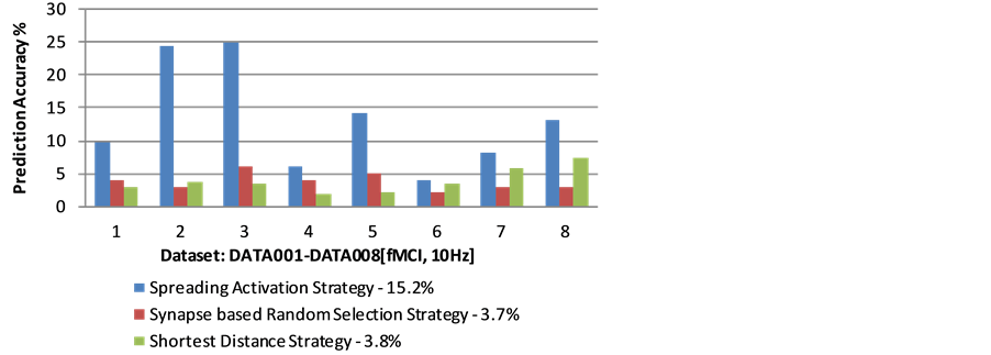 As a comparative study, we introduce two alternative strategies, namely the shortest distance strategy (the neuron which owns the shortest distance compared to other post synaptic neurons will be fired), and the synapse based random selection strategy (randomly select a neuron from the set of post synaptic neurons). As shown in Figure 1, the spreading activation based strategy outperforms other two strategies and the average prediction accuracy on 8 datasets is around 15.2%, at least three times better than the other two strategies (the average prediction accuracy for shortest distance strategy is 3.8%, while the synapse based random selection strategy is 3.7%). The validation shows that the proposed spreading activation strategy is potentially effective for predicting neural spikes in the neural network.