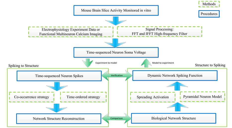 As Figure 1 shows, calcium images and neuron voltages from mouse slices data are collected by fMCI me- thod. Neural voltage signals based on the fMCI technique are with low Signal to Noise Ratio (SNR). Hence, signal processing to filter noise is necessary. Here we use Fast Fourier Transform (FFT) and Inverse Fast Fourier Transform (IFFT) methods to filter the high frequency noises so that spiking signals can be detected precisely. Then two methods to convert neural spike signals to neural structure are introduced, namely, the co-occurrence strategy and the time-ordered strategy. As a step forward, we propose a spike activity prediction method based on the predicted neural network, the spreading activation theory and single pyramidal neuron models.